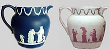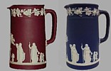 Almost as valuable as Crimson, is Tri-Color jasperware. Shown on the right is a bulbous jug of